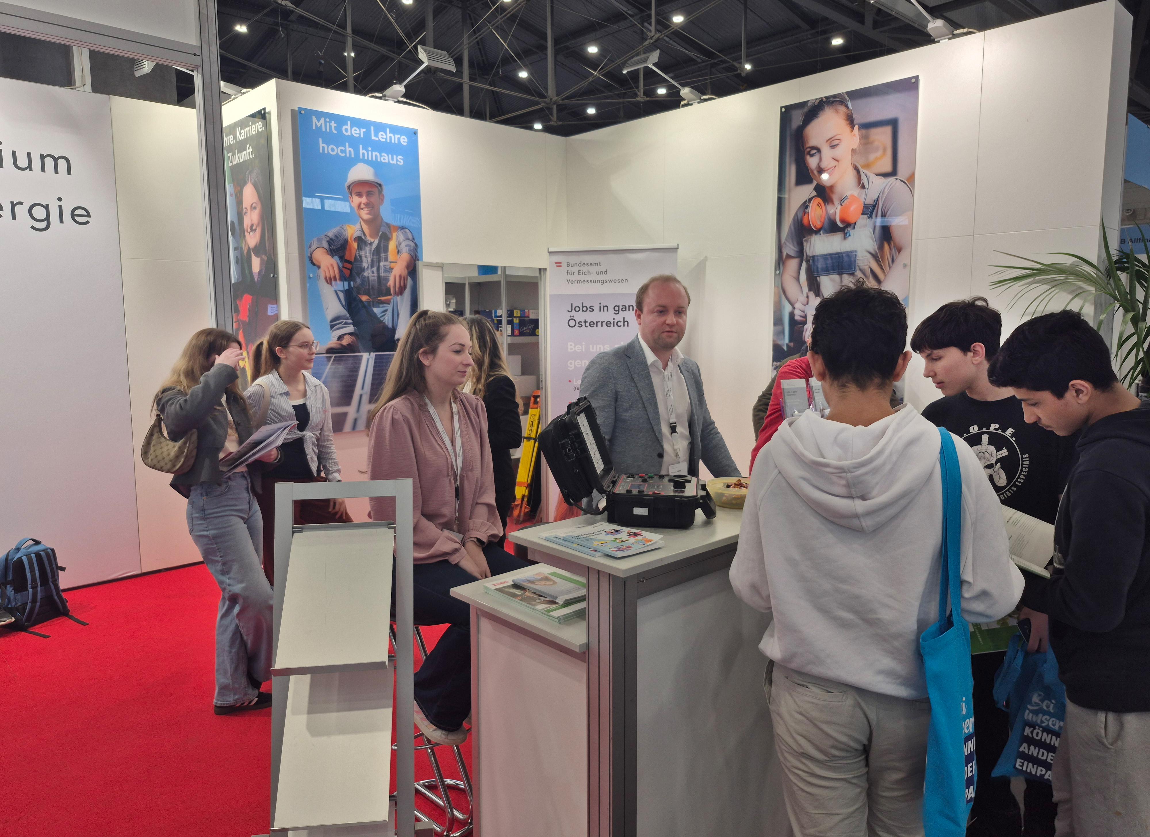 Ziel des BEV-Auftritts war es, nicht nur auf offene Stellen aufmerksam zu machen, sondern die breite Palette an Tätigkeitsbereichen greifbar zu machen. Verschiedene Messgeräte aus dem Bereich Eichwesen, ein Theodolit aus dem Bereich Grundlagenvermessung sowie ein Messkolben für Treibstoffe aus dem Eichamt Wien ermöglichten den Besucherinnen und Besuchern einen anschaulichen Einblick in die Arbeit des BEV.