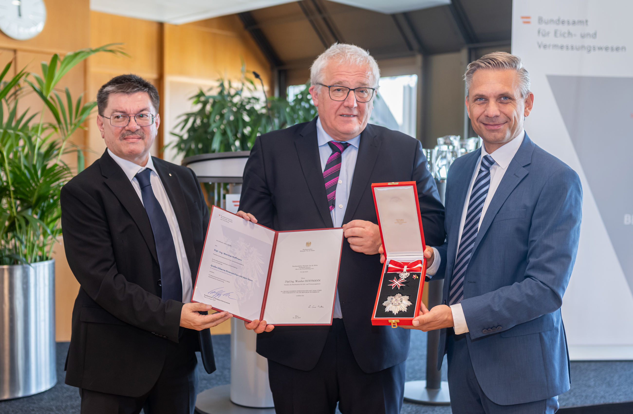Eine Ära geht zu Ende – Präsident Wernher Hoffmann verabschiedet sich in den Ruhestand 02.10.2025 - Nach über 36 Jahren im Bundesamt für Eich- und Vermessungswesen – BEV, davon fast 13 Jahre als Präsident, wurde Dipl.-Ing. Wernher Hoffmann am 30. September feierlich in den Ruhestand verabschiedet.