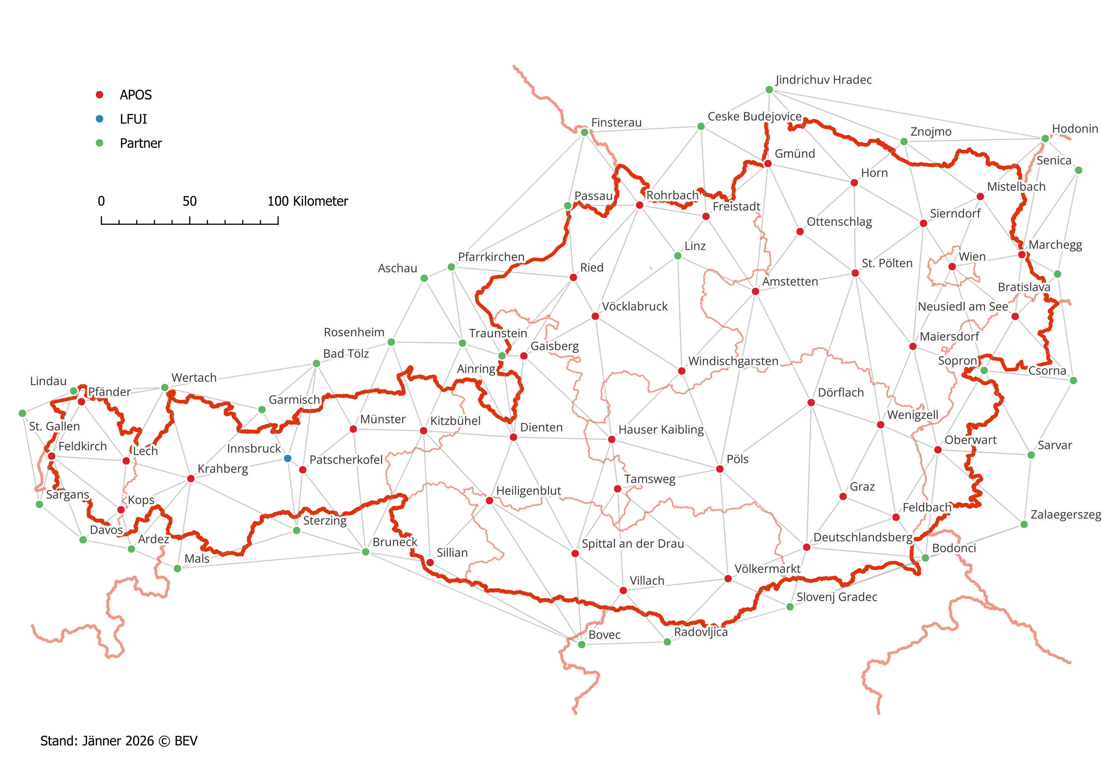 APOS Real Time basiert auf der Umsetzung einer österreichweiten sowie länderübergreifenden Stationsvernetzung (siehe Abb. 2). Die seit Anfang 2009 realisierte Zusammenarbeit mit allen Vermessungsverwaltungen (Stationsbetreibern) der Nachbarstaaten gewährleistet eine erhöhte Systemverfügbarkeit verbunden mit einer gesteigerten Performance bis an die Staatsgrenzen. APOS liefert somit österreichweit flächendeckend homogene 3D-Koordinaten im System ETRS89 in Echtzeit.